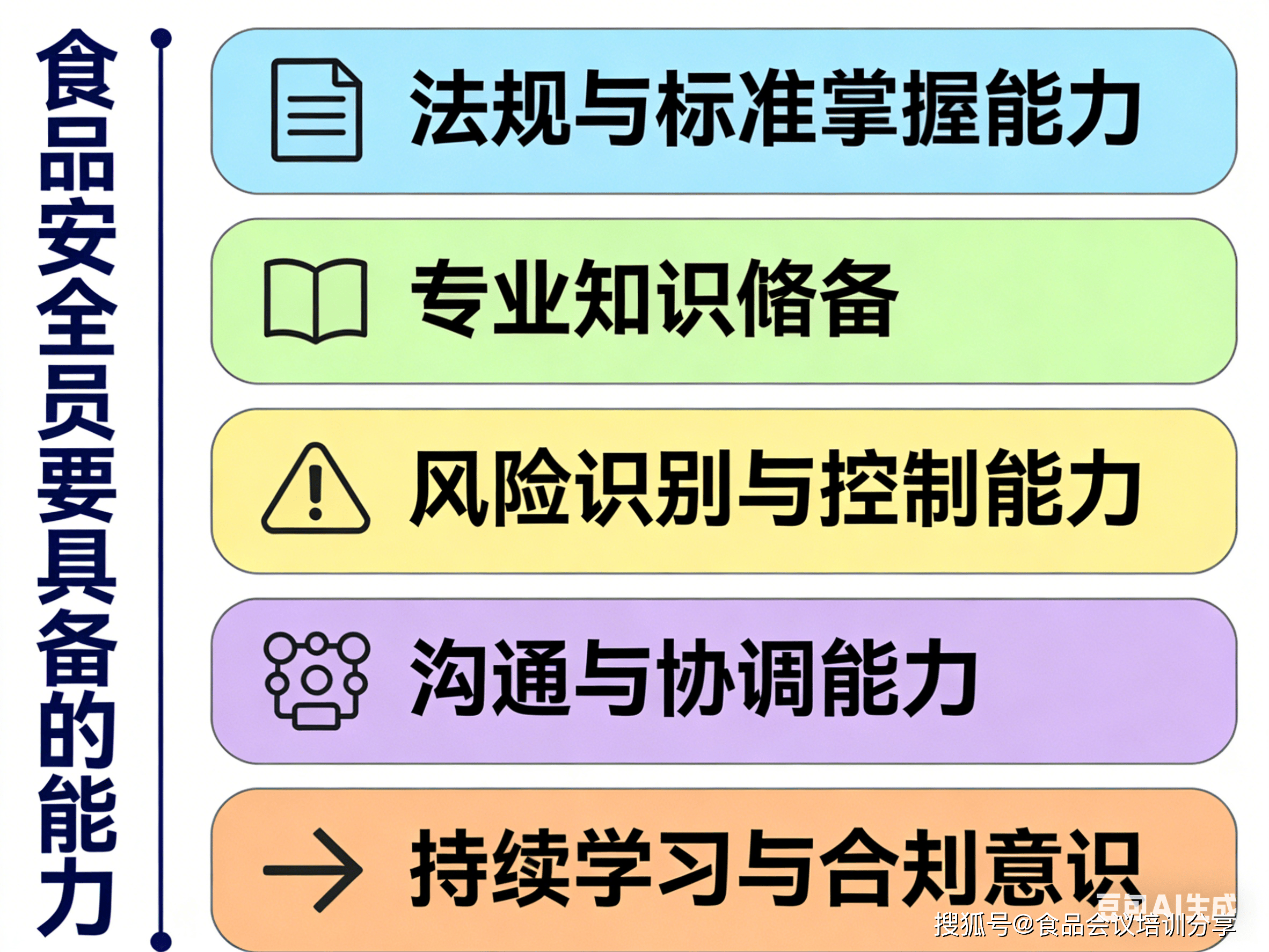 全面控制《中华人平易近国食物平安法》《食物平安法实施条例》《食物出产运营监视查抄办理法子》等焦点律例,明白企业的义务(如 “全过程节制”“从体义务”)及违法后果(罚款、吊销许可、刑事义务等)。熟练使用食物平安国度尺度(GB 系列),包罗原料平安尺度(如 GB 2762 污染物限量、GB 2763 农药残留)、出产卫生尺度(如 GB 14881 食物出产通用卫生规范)、查验方式尺度(如 GB 4789 微生物查验)等,确保出产全流程合适尺度要求。控制食物微生物学(如致病菌污染风险、菌落总数节制)、食物化学(如沉金属、添加剂、兽药残留等化学风险)、食物工艺学(如热加工、冷藏、包拆等环节的平安节制点)等焦点学问,能识别分歧食物品类(如生鲜、罐头、烘焙)的特有风险。熟悉 HACCP(风险阐发取环节节制点)、ISO 22000 食物平安办理系统、SSOP(卫生尺度操做法式)等系统的焦点逻辑,能理解 “风险防止”“过程节制” 而非 “结尾查验” 的办理。能通过原料验收、出产过程放哨、识别生物风险(如沙门氏菌、霉菌)、化学风险(如不法添加剂、农残超标)、物理风险(如金属异物、玻璃碎片)及工艺风险(如杀菌不完全、冷链断链)。能针对识此外风险采纳立即办法(如暂停出产、隔离问题原料),并鞭策落实改正防止办法(如优化清洗流程、升级检测频次)。能取出产、采购、研发、发卖等部分无效对接(如向采购部分明白原料验收尺度,向出产部分强调环节节制点操做规范),确保食物平安要求贯穿全链条。能共同监管部分的查抄(供给记实、注释流程),取供应商沟通质量要求,或向消费者解答根本食物平安问题。关心律例取尺度更新(如国度卫健委发布的新国标、市场监管总局的监管动态),自动加入行业培训(如 HACCP 内审员、食物平安办理员证书培训),确保办理方式取行业要求同步。具备 “零” 的合规认识,明白食物安满是企业底线,杜绝 “侥幸心理” 或 “成本优先” 的违规操做。感乐趣的记得留言哦。食物会议培训核心,分享食物行业会议培训动态,充实满脚您的进修需求。前往搜狐,查看更多。